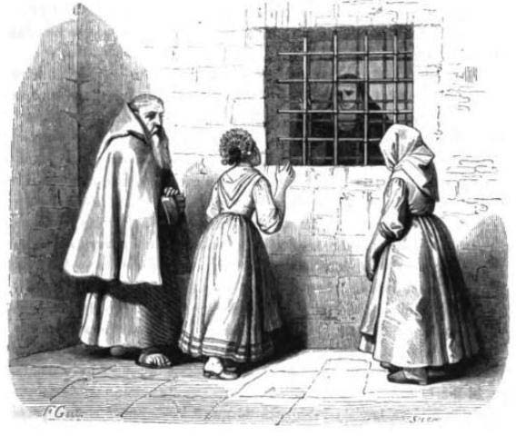 Il gruppetto giunge alla porta del monastero, dove il padre guardiano congeda il carrettiere, chiedendogli di ritornare dopo due ore per ricevere la risposta sull’esito dell’incontro.